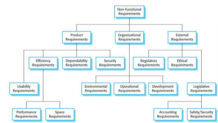 Product requirements – Define or constrain software behavior, such as performance (speed, memory use), reliability, security, and usability.