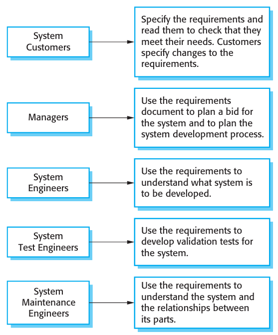 The requirements document serves a wide range of users—from senior management funding the project to engineers building the software—each relying on it for different purposes.