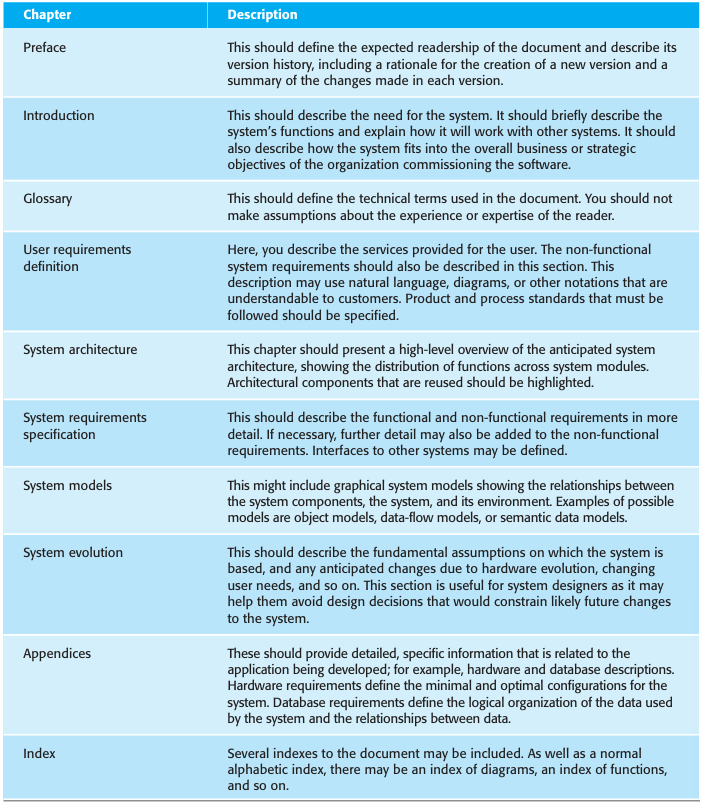 The content of a requirements document depends on the software type and development approach. In evolutionary development, the document emphasizes user requirements and high-level non-functional requirements, leaving out detailed specifications. Designers and programmers then use their judgment to address the outlined needs.